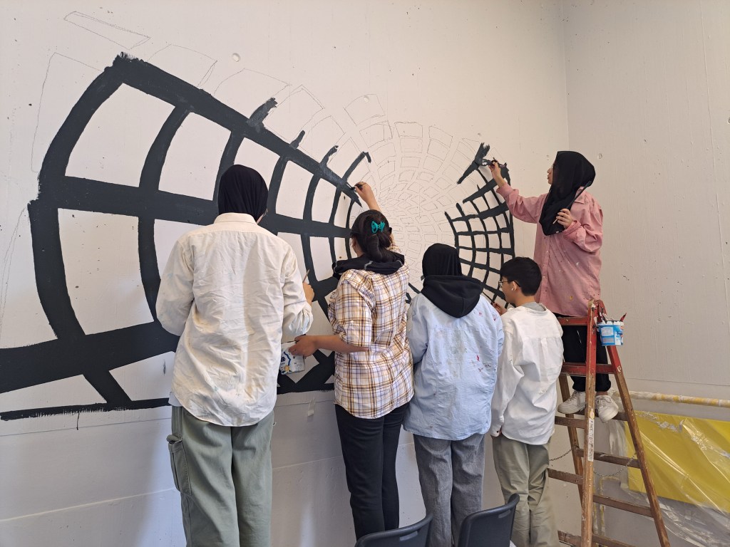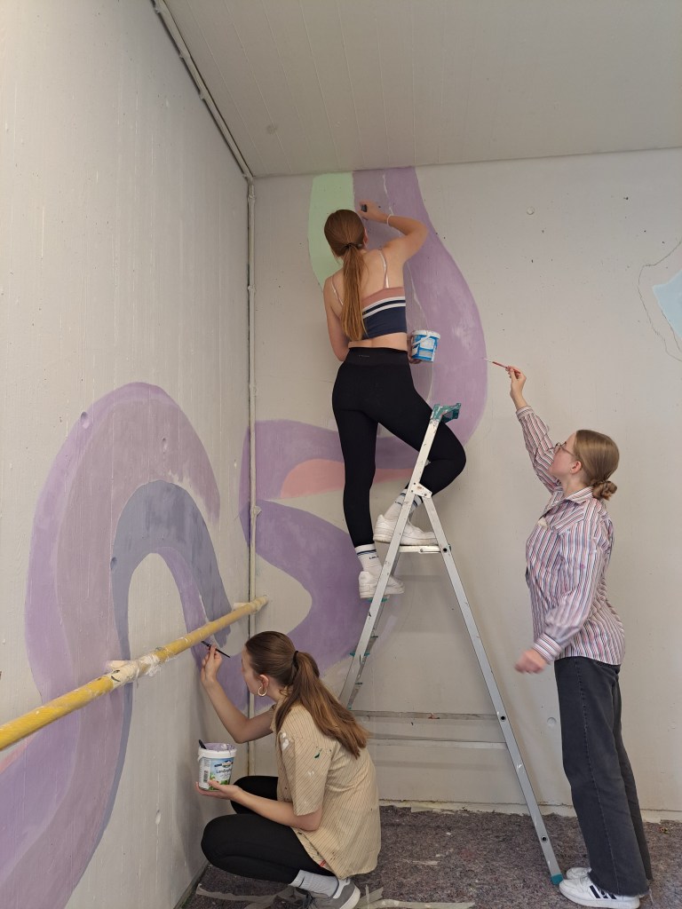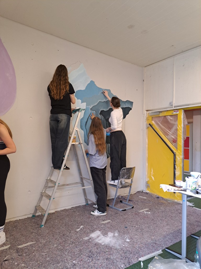 Im Rahmen der Projekttage haben Schüler*innen der Jahrgangstufen EF und Q1 das Treppenhaus des E-Traktes (Teil des ehemaligen Grundschulgebäudes) neu gestaltet und vom ehemaligen Grundschulcharme befreit! Viele Vorarbeiten wie das Abkleben, Grundieren, die Konzepterstellung waren nötig, bevor die Wände endlich neu gestaltet werden konnten!